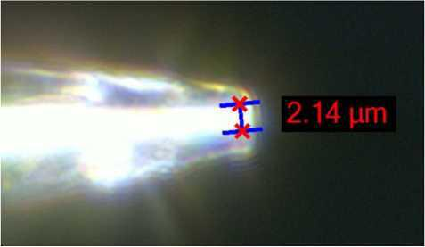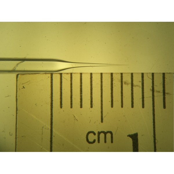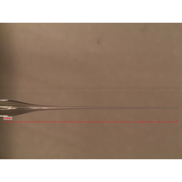 產(chǎn)品包裝系統(tǒng)為模制玻璃瓶(壁厚)、易變形材質(zhì)如輸液軟袋等不適合激光打孔技術(shù),可選用玻璃微滴管方式制作陽性樣品(見下圖): 玻璃微滴管的孔徑可以低至0.1m,但尖端非常脆弱,因此